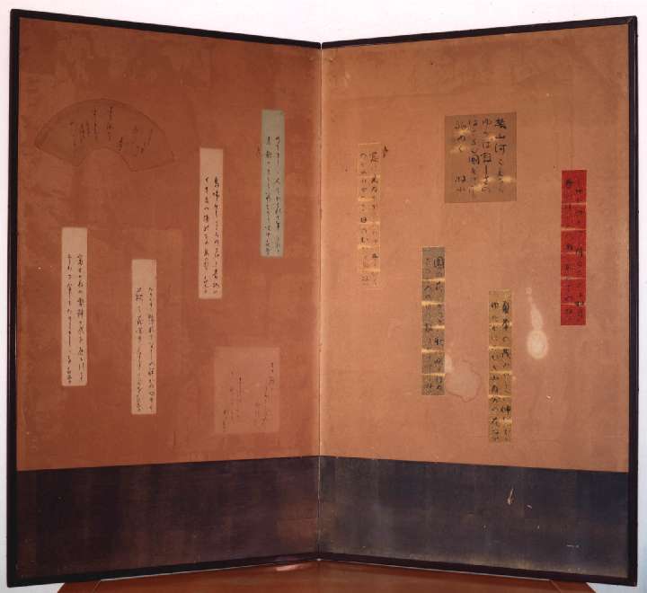 喜志子(左)と牧水(右)の直筆色紙短冊が貼られた「比翼の屏風」