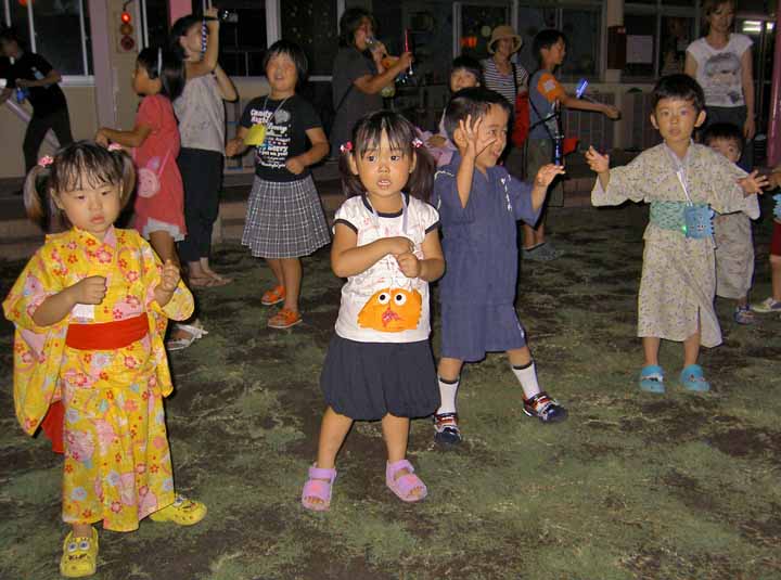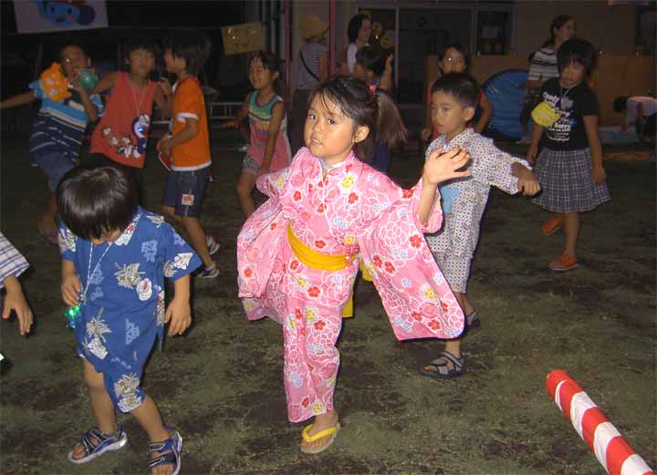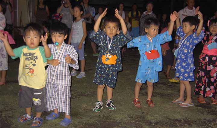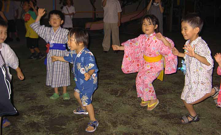 園庭で「盆踊り」をたのしむ園児たちと卒業生(7)