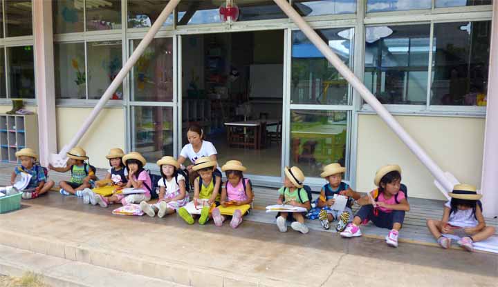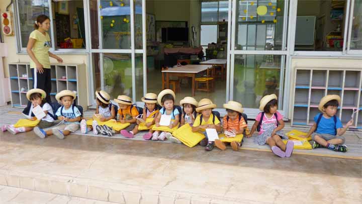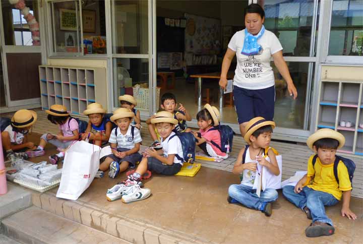 テラスで親御さんのお迎えを待つ 園児たち
