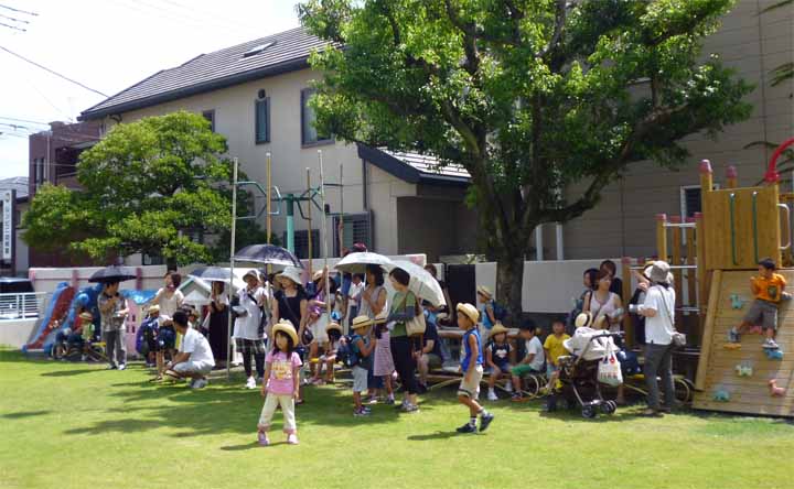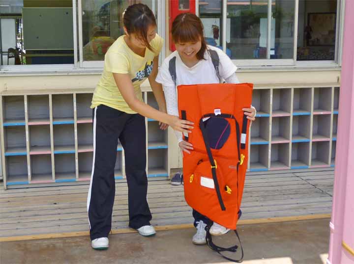 津波避難に備えて購入した ライフジャケットの説明をする園長