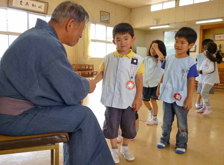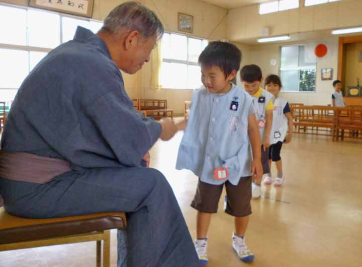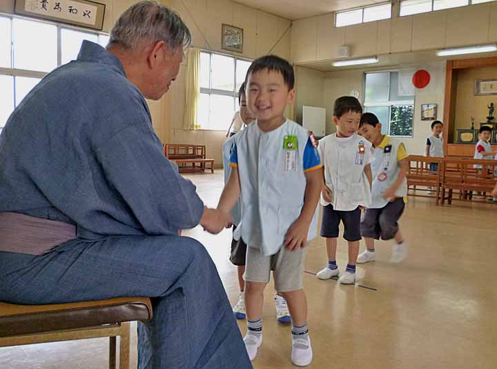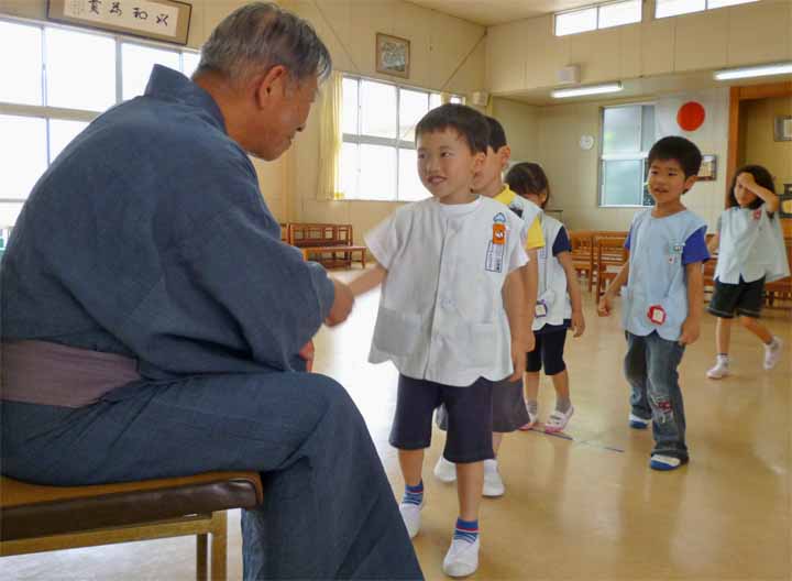 式典が終わり 園長と握手して教室へ戻る園児たち(年 長)(1)
