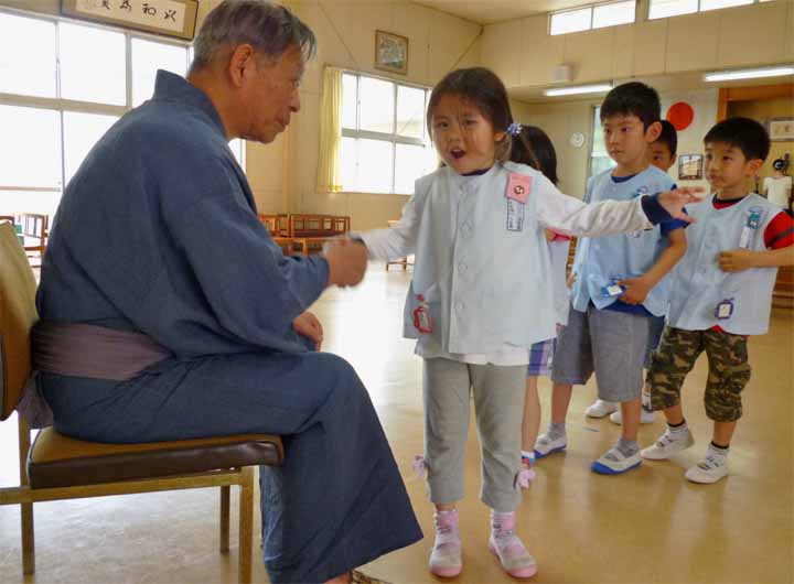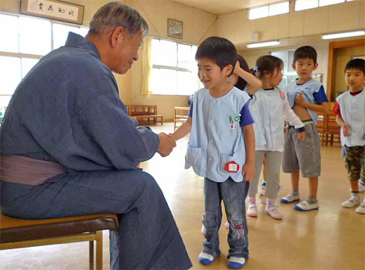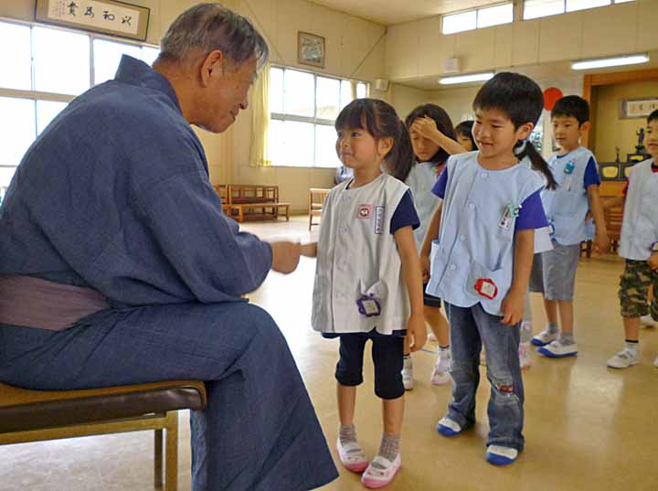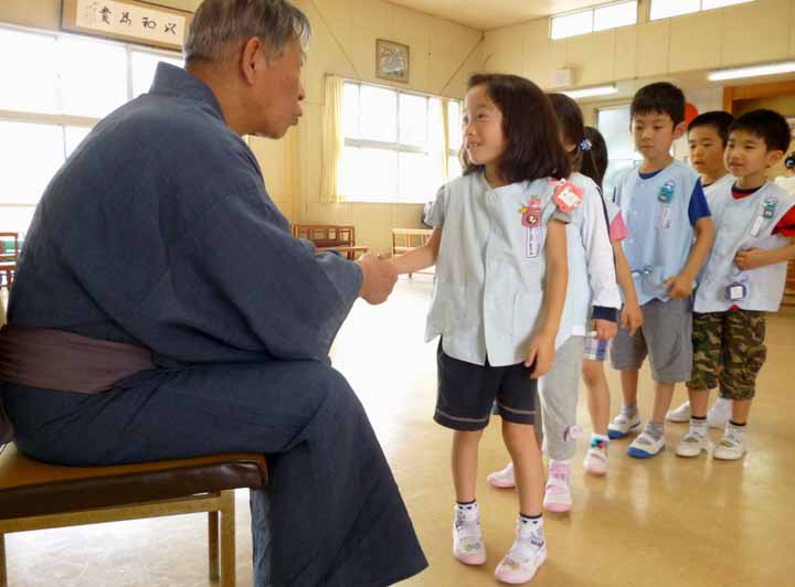 式典が終わり 園長と握手して教室へ戻る園児たち(年 長)(2)