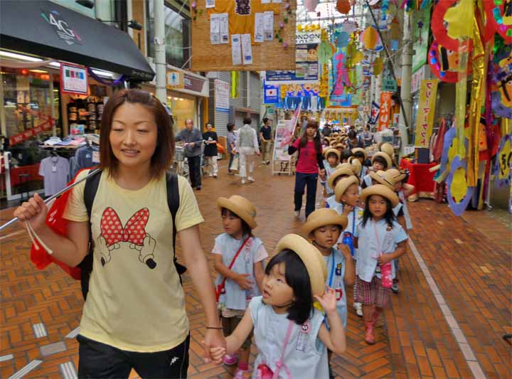 仲見世商店街の七夕飾りを見る 園児たち(3)
