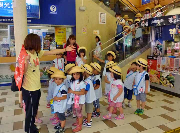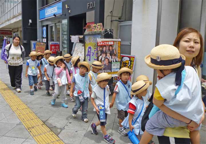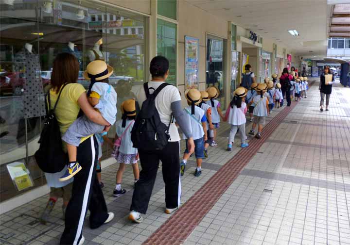 バ ス 停 へ 移 動 す る 園 児 た ち