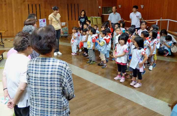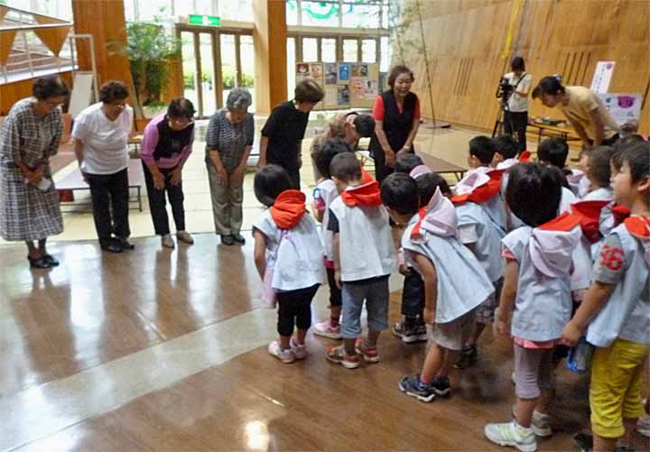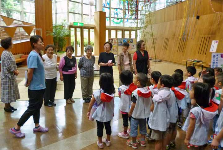 「すこやか沼津 第二支部」の皆さんのお話を聞く園児たち