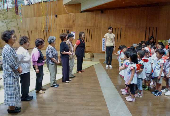 一緒に七夕飾りをつくっていただく「すこやか沼津 第二支部」の皆さんとあいさつ