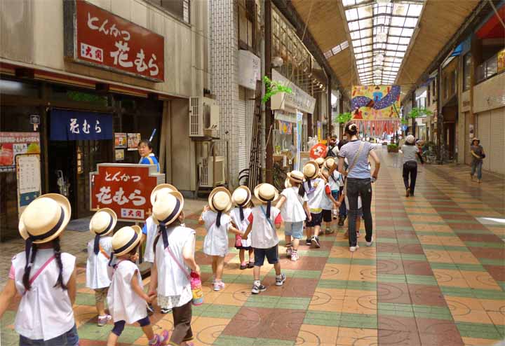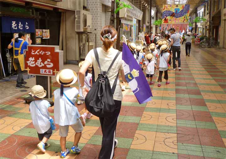 新仲見世商店街の七夕飾りを見る 園児たち(1)