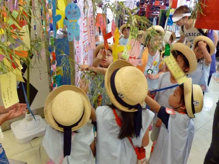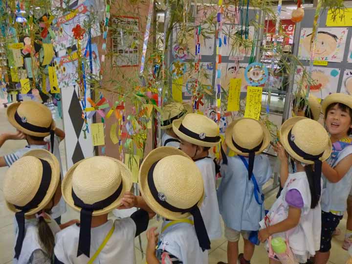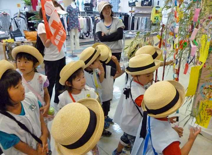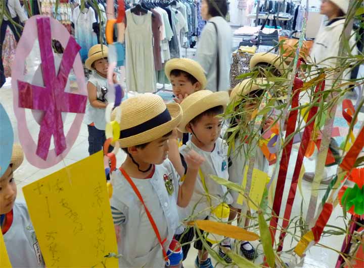 沼津駅ビル・アントレ内の「お絵かき展」と七夕飾りを見る園児たち(3)